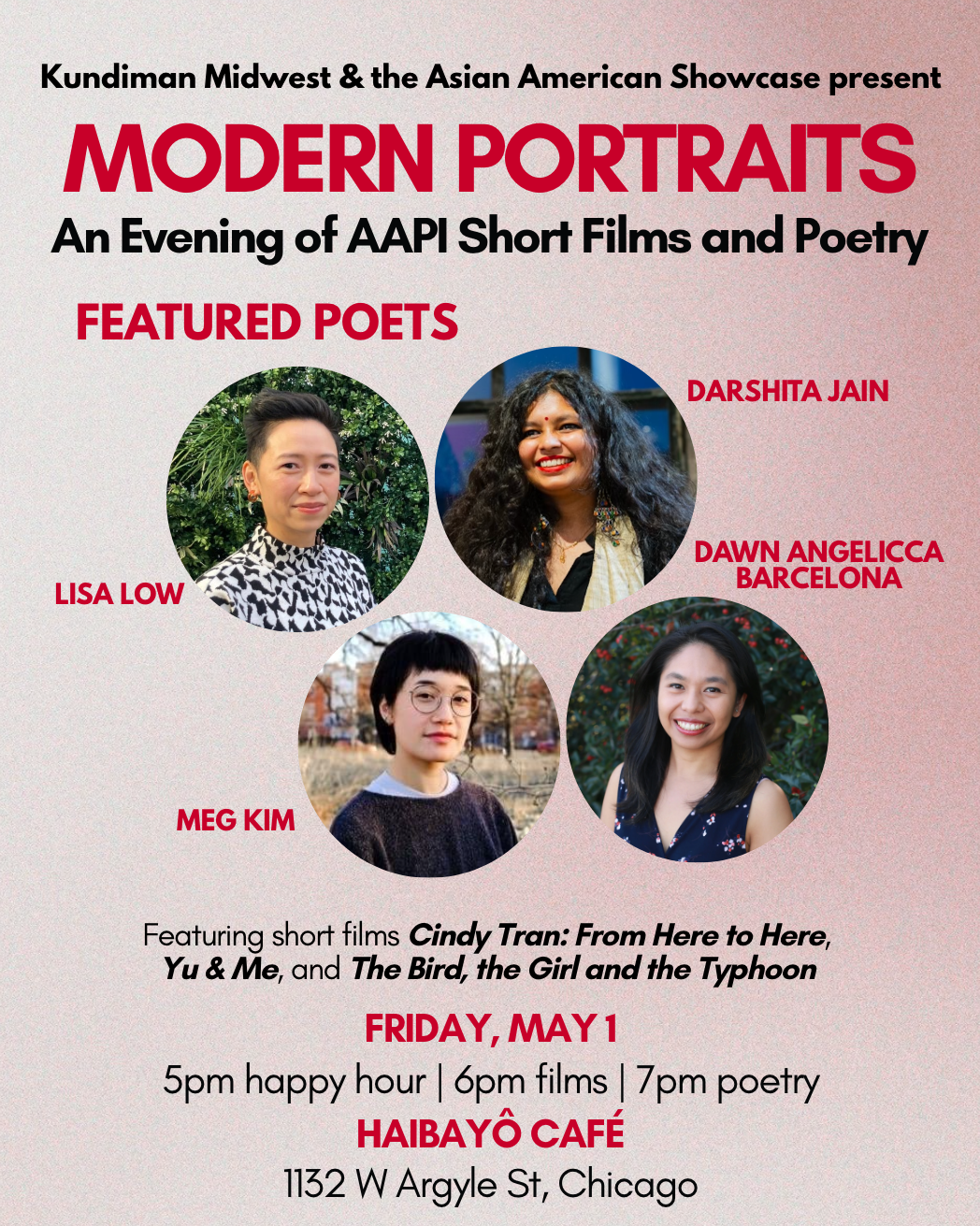 Come early to connect with Chicago film lovers, writers, and creatives during our community mixer, then stay to experience a celebration of AAPI voices through film and poetry. After a screening of literary-inspired documentaries and experimental animation, enjoy a live reading by poets Lisa Low, Meg Kim, Dawn Angelicca Barcelona, and Darshita Jain.